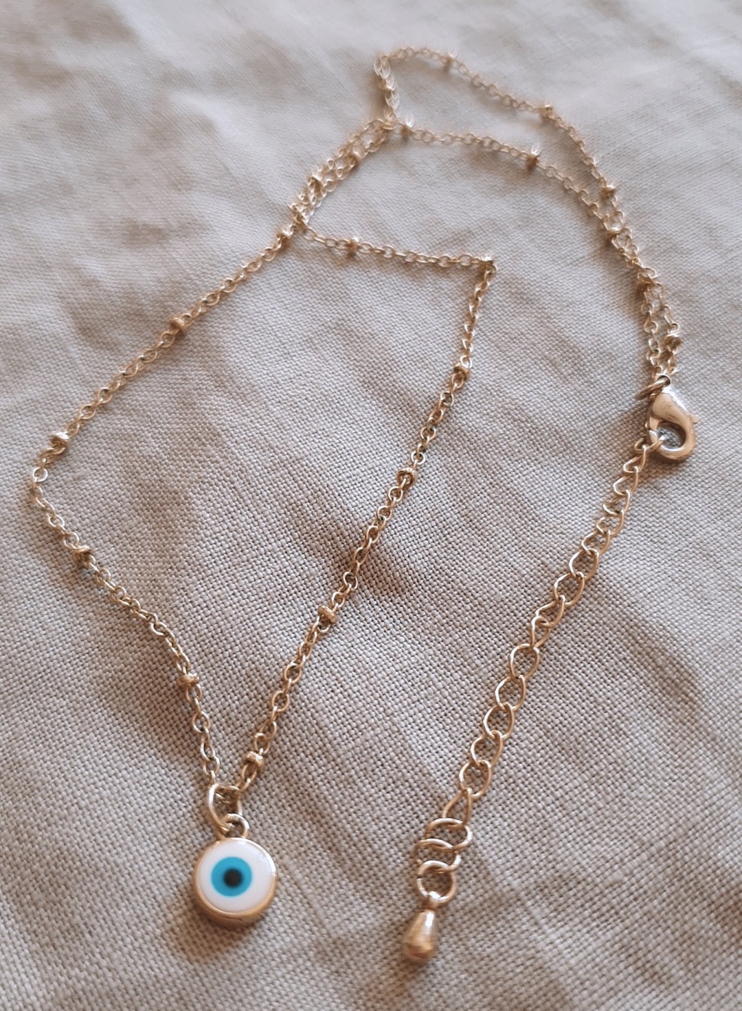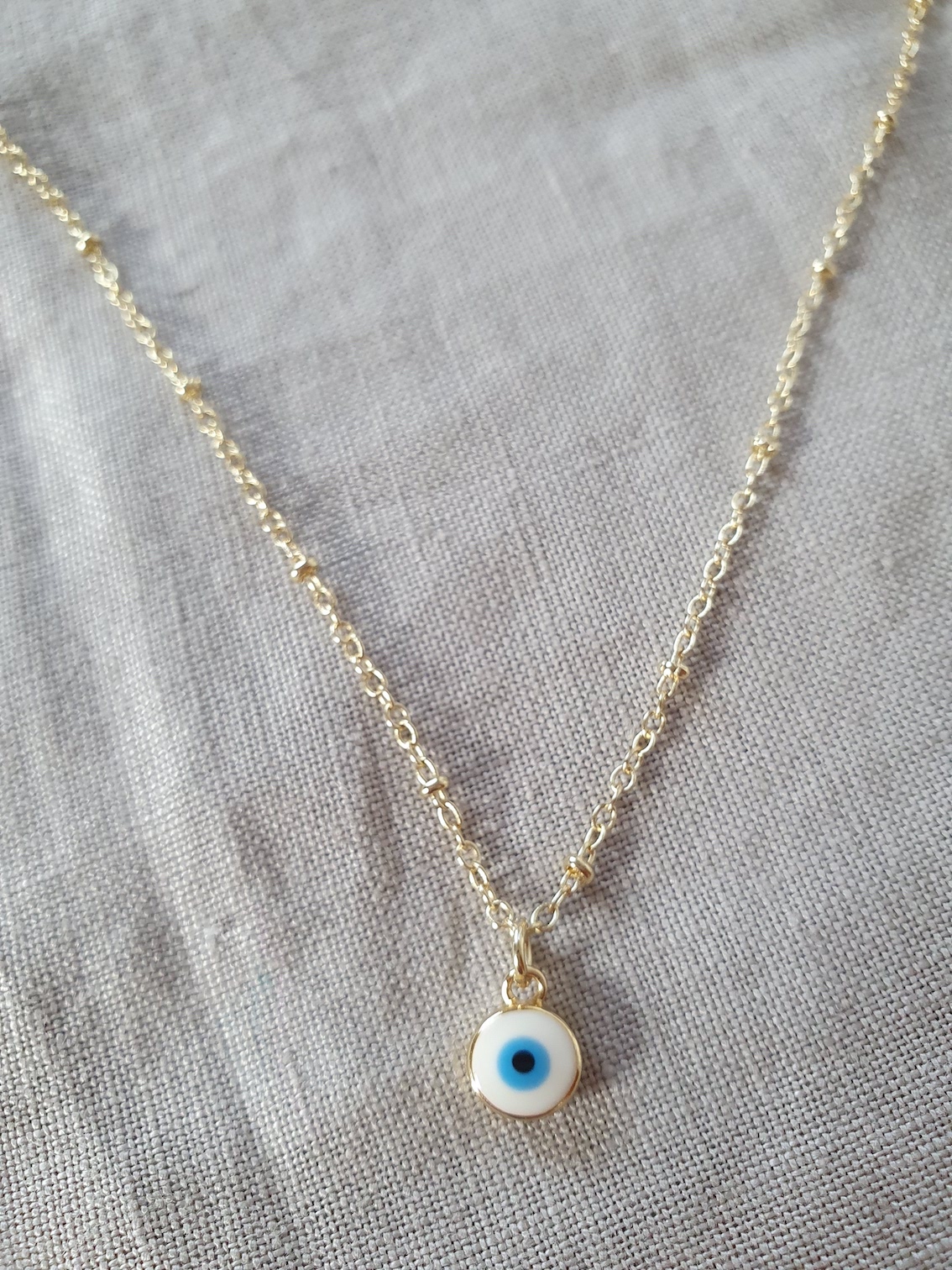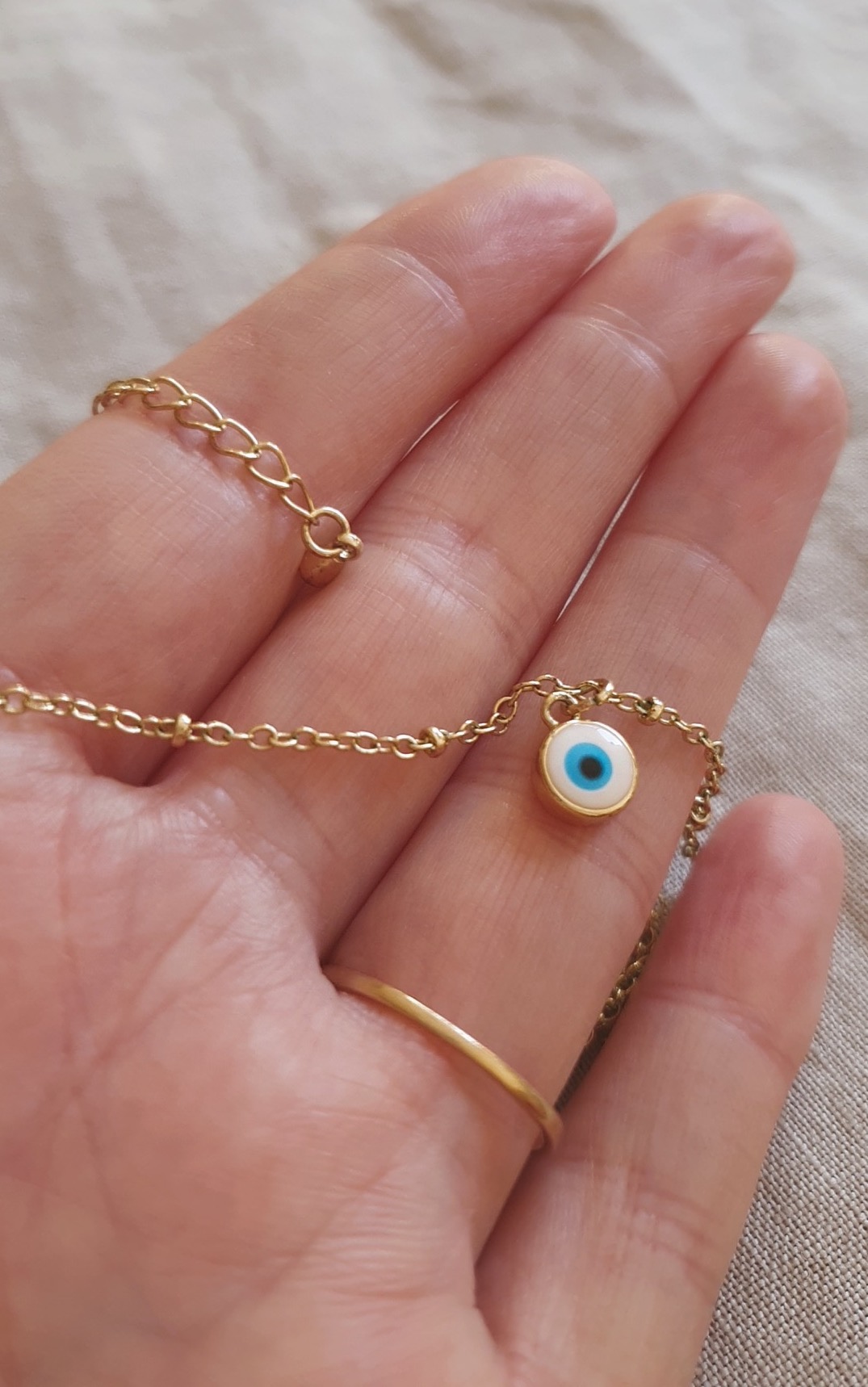 Made with a gold coloured stainless steel chain, and a beautiful goddess eye pendant. The pendant is 14k gold coloured stainless steel and enamel. The chain is adjustable in a few steps so you can adjust the size a little bit. Designed to have kind of tight around the neck which looks so good with this dainty design ♡ because of the gold filled pendant, be careful with alcohol based perfume or lotion, chemical shampoo or soap, and salt water- your jewelry piece will last way longer that way ♡ the chain is well tested by me, and should last on all your adventures, even so- be a little careful with this dainty design, the chain is not tear resistant because of its delicate nature.
