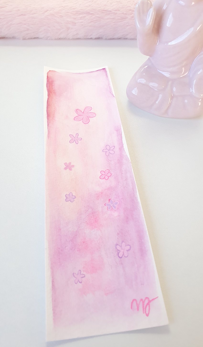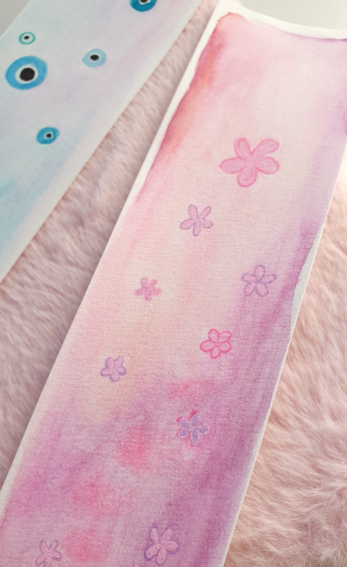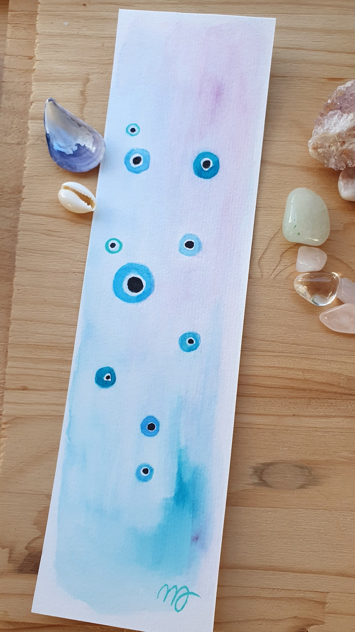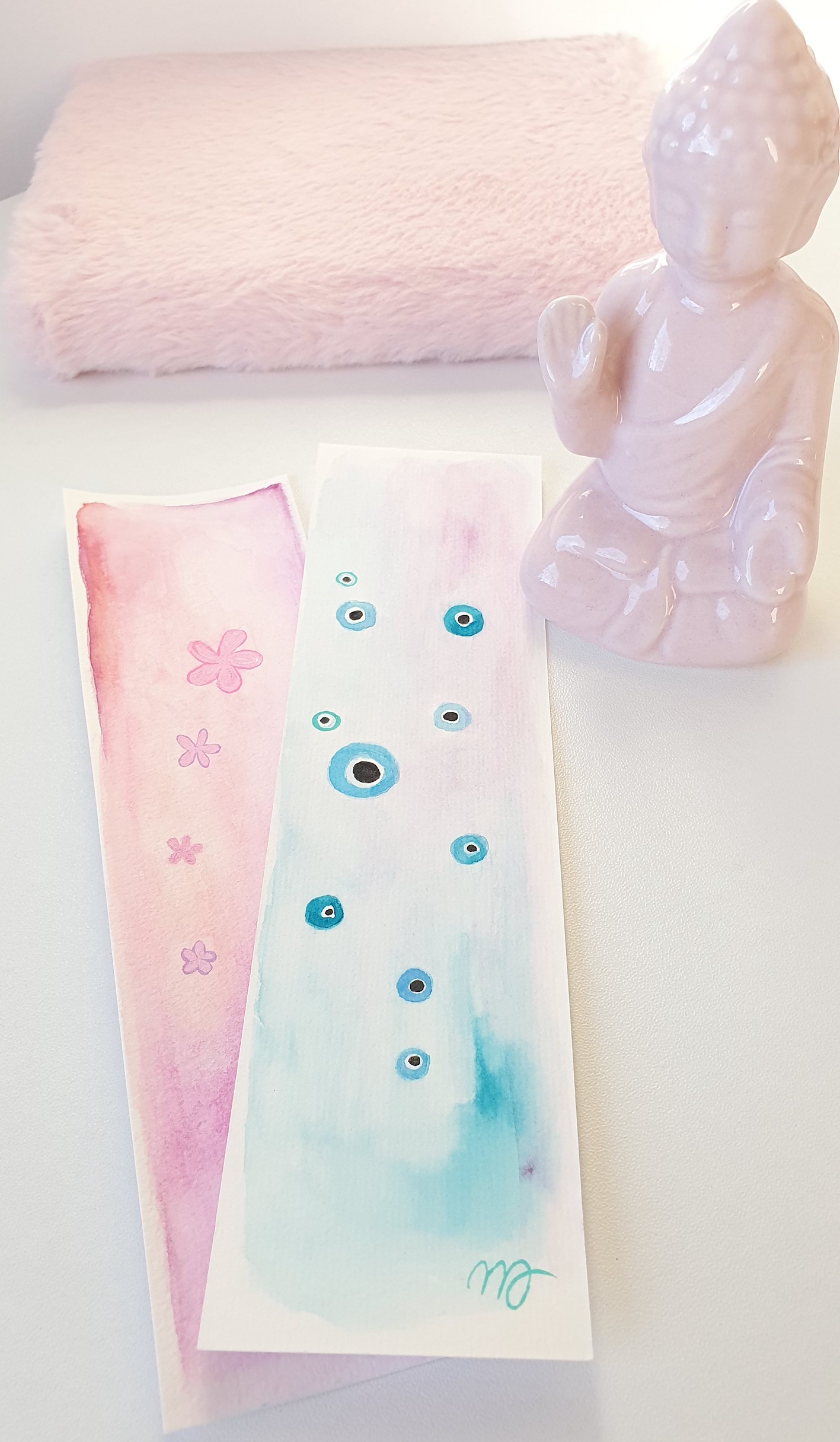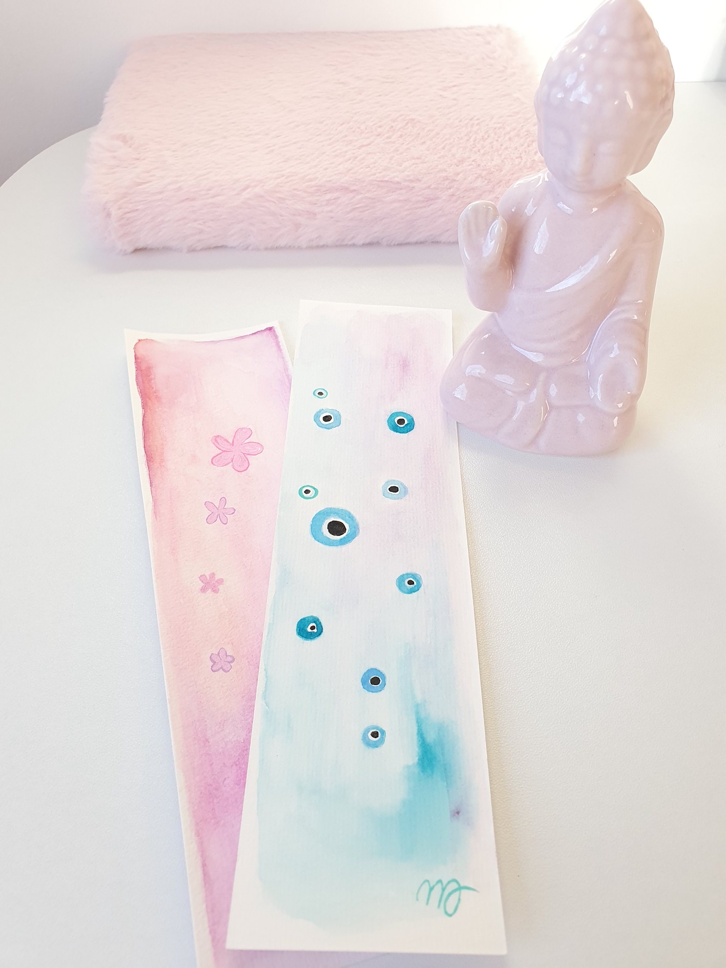 Symbols can have meaning for us when we let them. Two art pieces inspired by spring and summer. The pink flower bookmark is inspired by the flowers of spring, and the awakening of the earth after the long winter. The eye symbol bookmark is inspired by summer, the Mediterranean and the mystery of the sea- the eye also can be a symbol of divinity and protection.